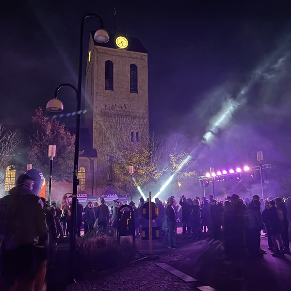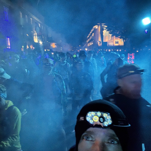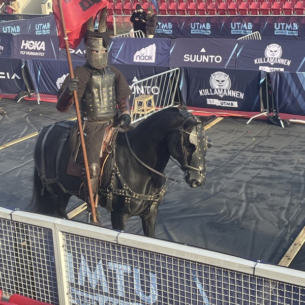 At the starting line the loudspeakers emitted a (quite amusing) pre-start prayer before the church bells rang. That was our start signal: The Kullamannen knight on horseback led us out beneath neon lights while the crowd cheered for us.