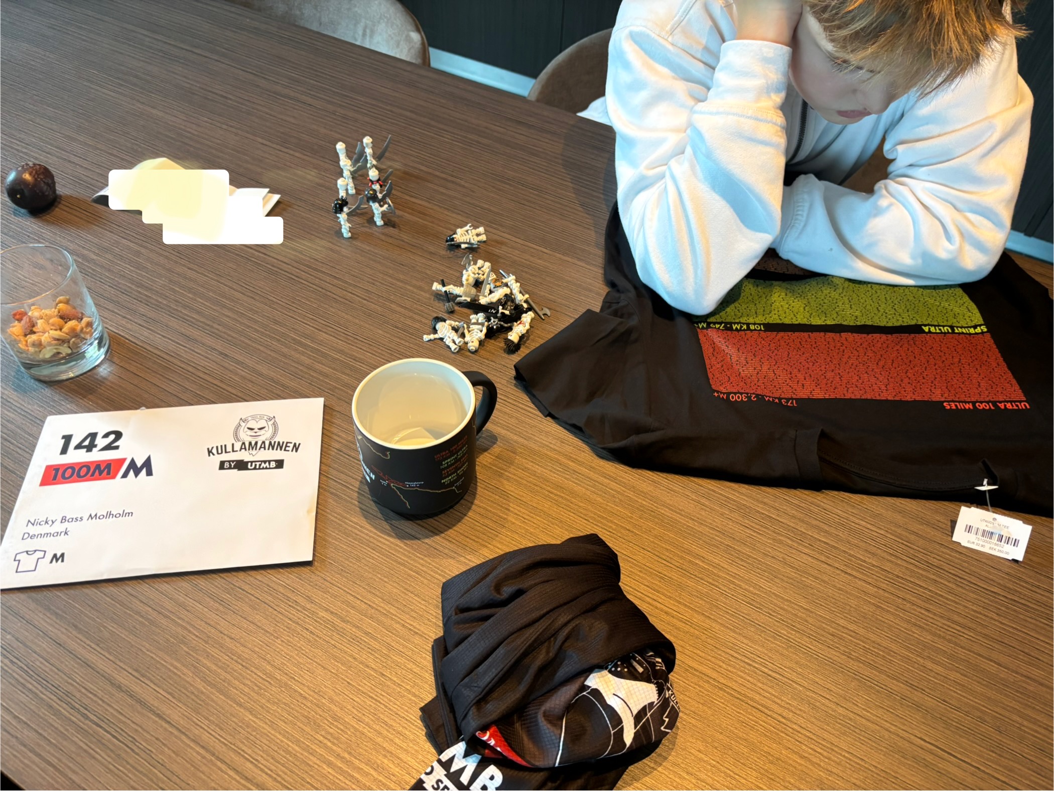 I was met by my lovely family there. In fact Casper, my youngest boy, joined me to run the last meters all the way to crossing the finish line 🥰. And, of great importance, I got my second Kullamannen ring 👏🏼, earned another 4 UTMB running stones, and a nice pizza at the hotel.