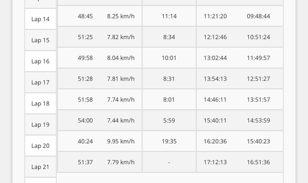 After 12 hours (08:00) we celebrated 50 miles. After 15 hours (11:00) we celebrated 100K 💪🏻. And by then I was definitely starting to feel the effort. The particularly tough thing about this route is the 100 meters of elevation gain and loss per loop. The relentless cumulative downhill started leaving its mark on my quads, and I wasn’t the only one noticing — I could hear fellow runners grumbling about exactly the same thing 😆. Honestly, I had completely forgotten that was such a challenge from the previous years. And to make it worse, I hadn’t done much elevation-focused training in the past six months, so it probably hit harder than it otherwise would have.