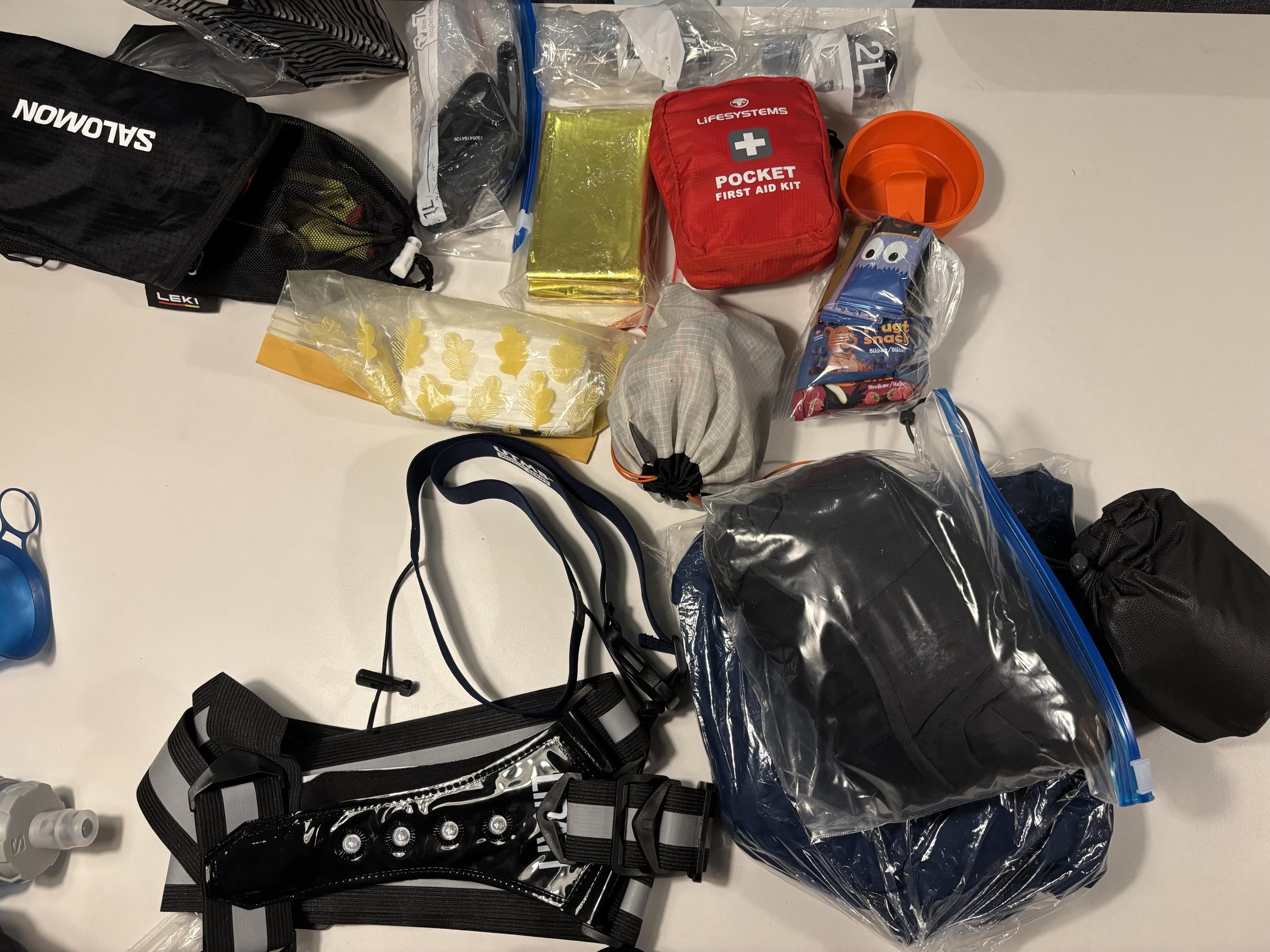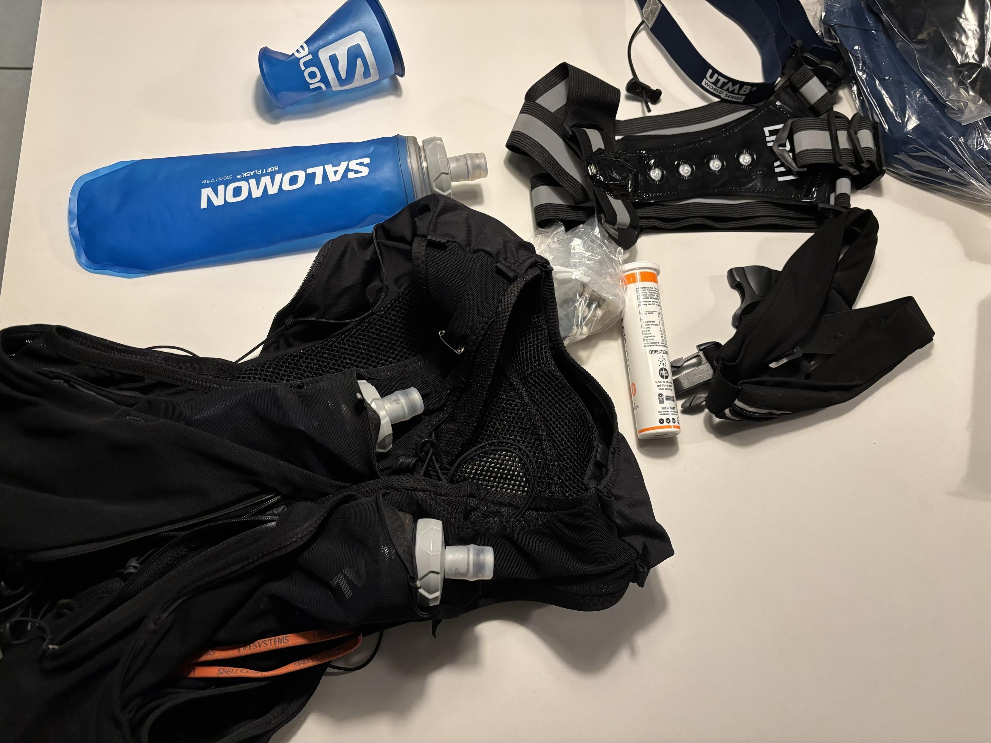 Vest: 3 x 500ml water bottles. 1 collapsible cup, 1 hard soup cup, emergency kit/blanket/toilet paper/calories/whistle, 2 x headlamps (with spare batteries), lots of gels and salt tablets, waterproof trousers, long armed shirt, extra waterproof jacket