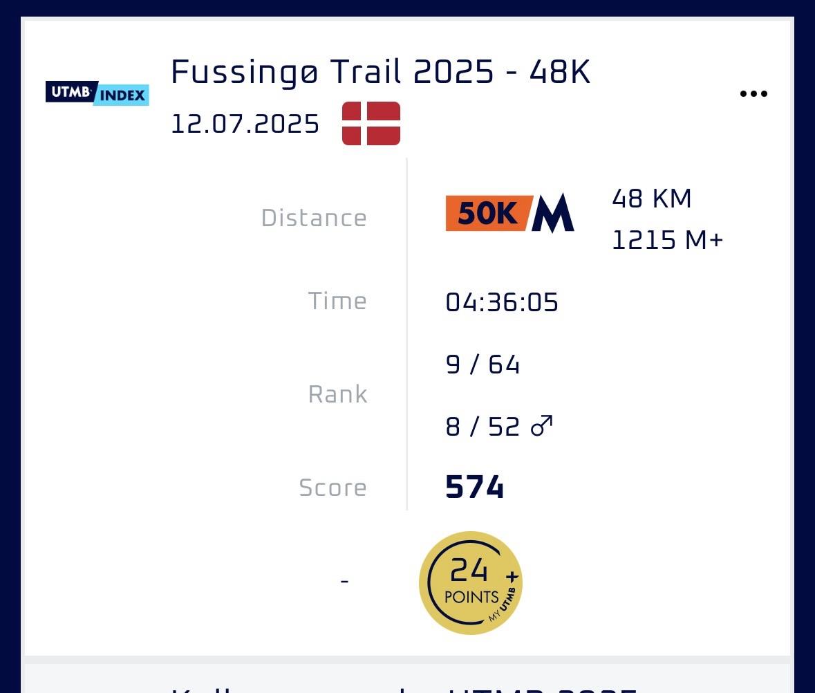 I have to brag about this (skip if you dislike ego crap like this π): The FussingΓΈ trail race I ran a month back has got the highest UTMB Index score to date for me: 574 π€―πππ».